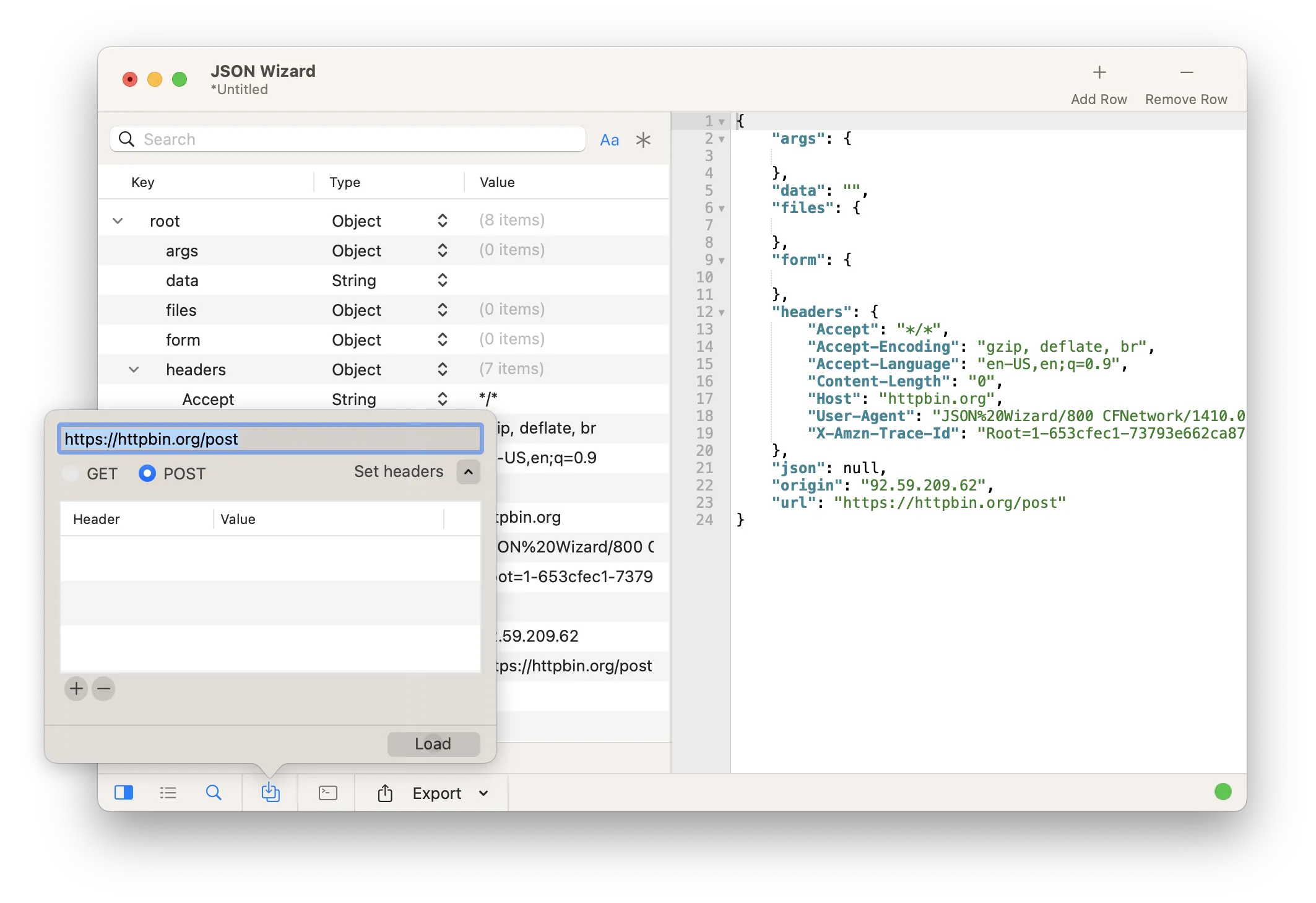 Import your JSON and work on the response directly. Do you want to access a network resource? You can actually perform a GET/POST request directly from within the app. It's as easy as that!