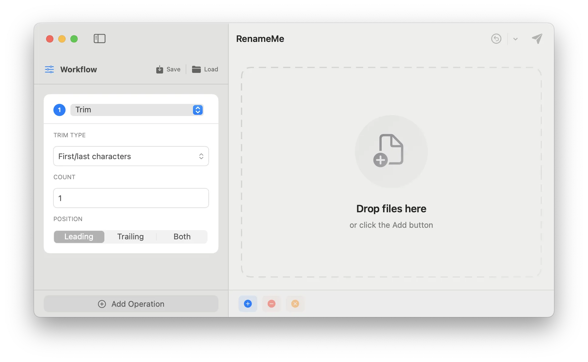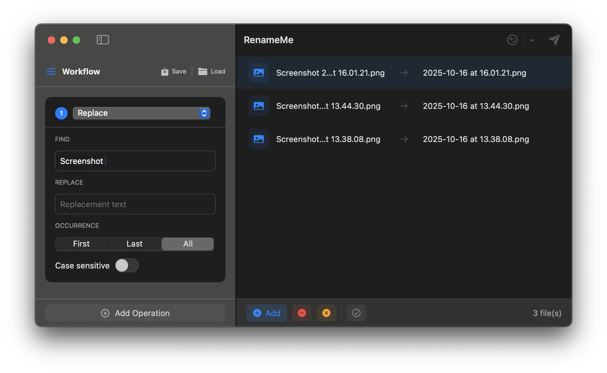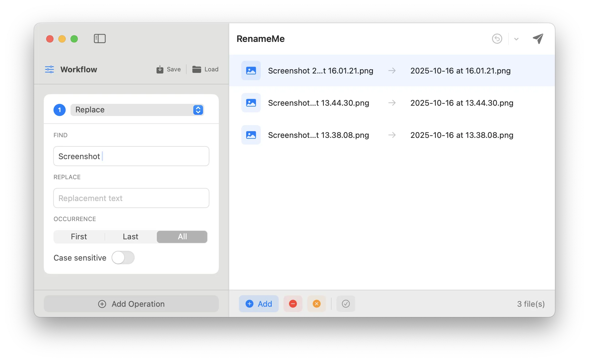 Drop files into RenameMe or click Add to browse. The app shows both original and new names side-by-side for clarity.