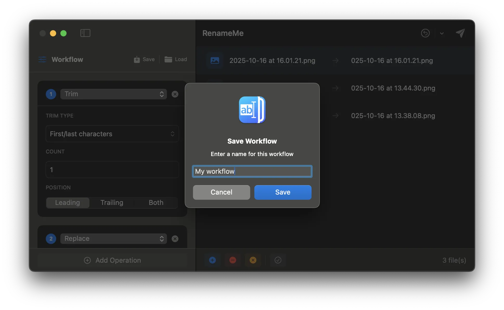 Click Rename to apply changes. Love your workflow? Save it for next time with a single click—no need to rebuild it!