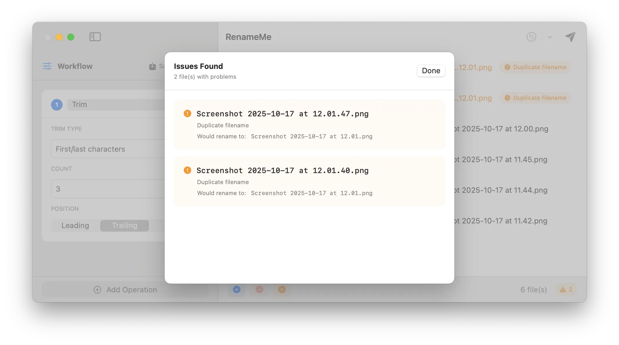 See exactly how your files will be renamed before you commit. Catch conflicts and errors instantly with visual indicators.