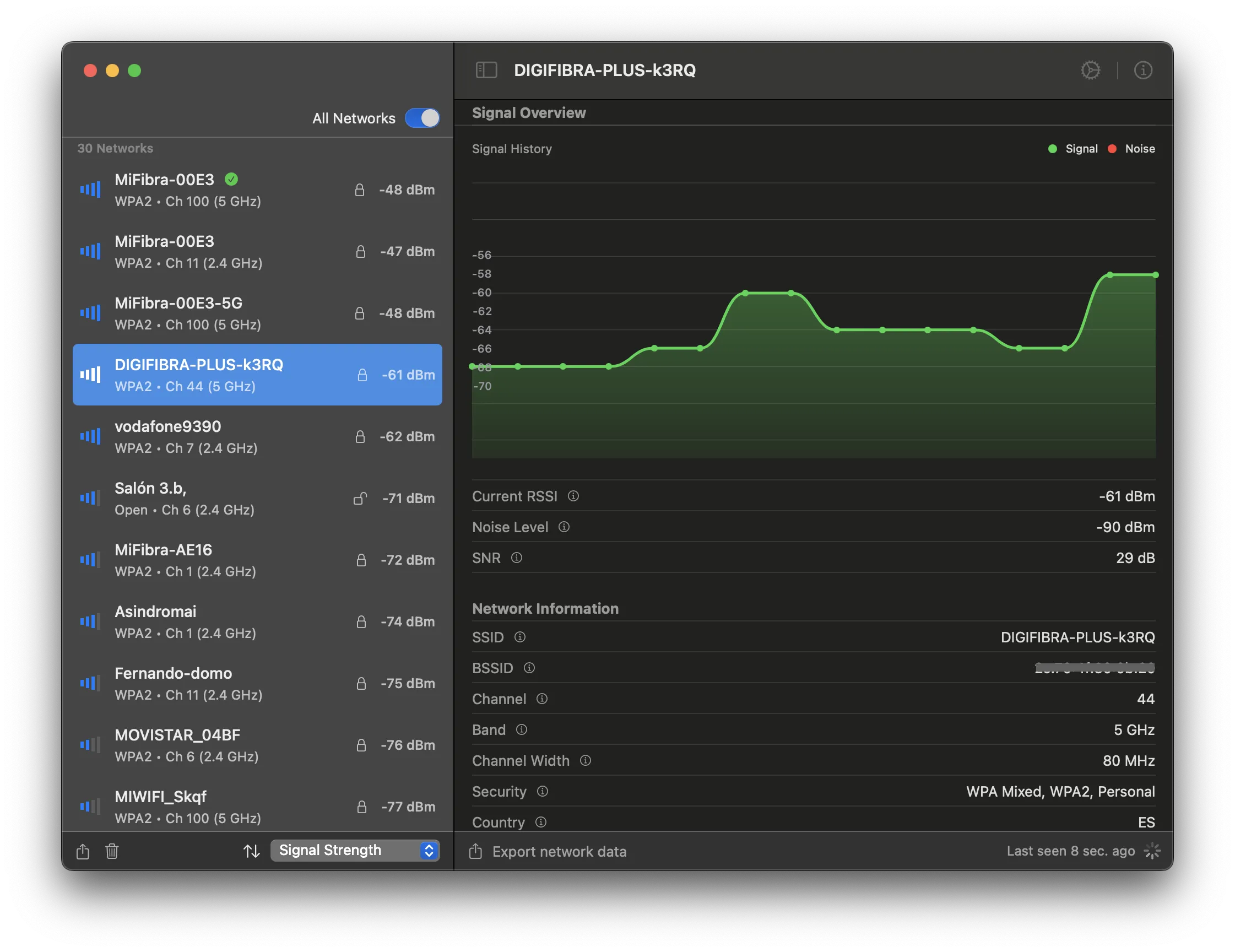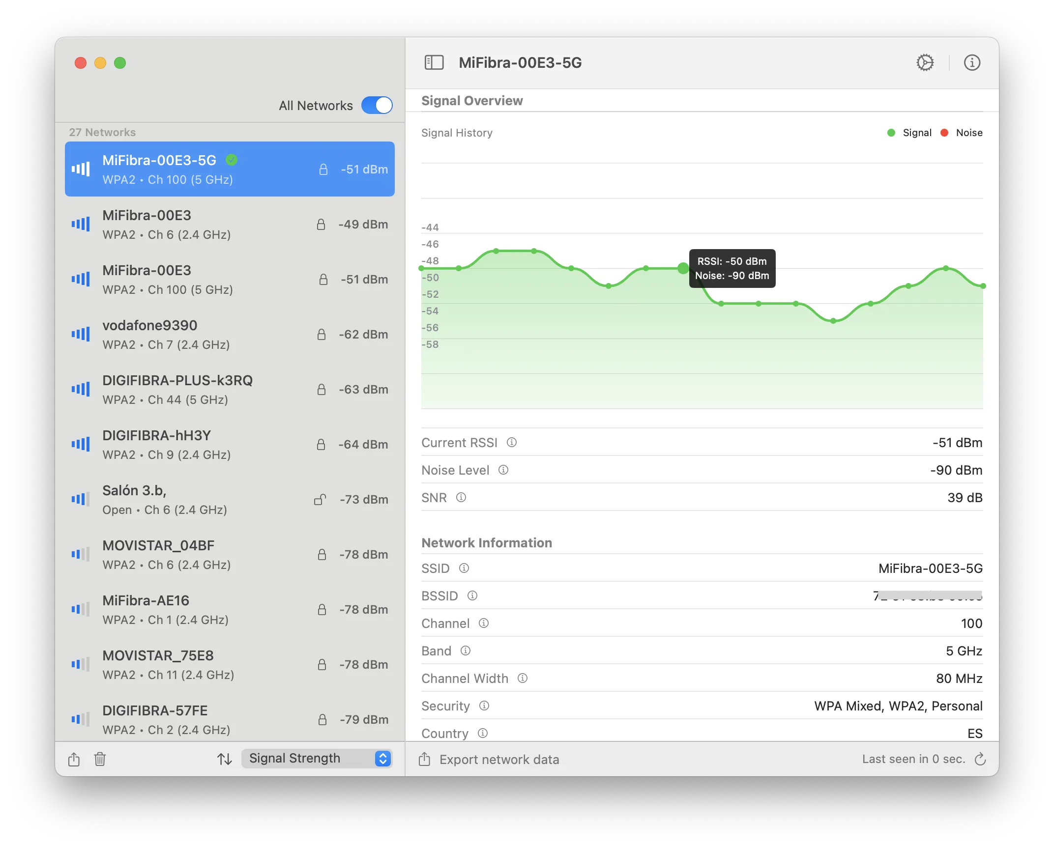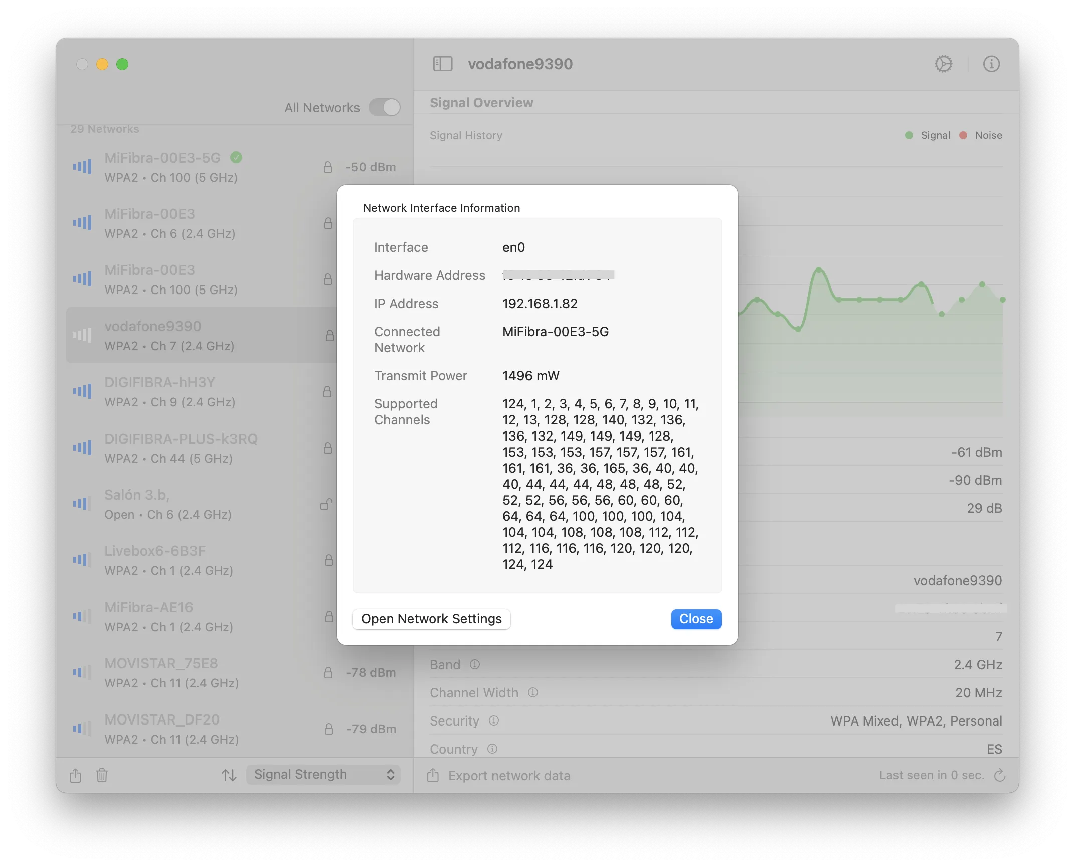 Dive into detailed network insights like BSSID, channel info, and live signal charts. Identify interference and optimize your WiFi setup.