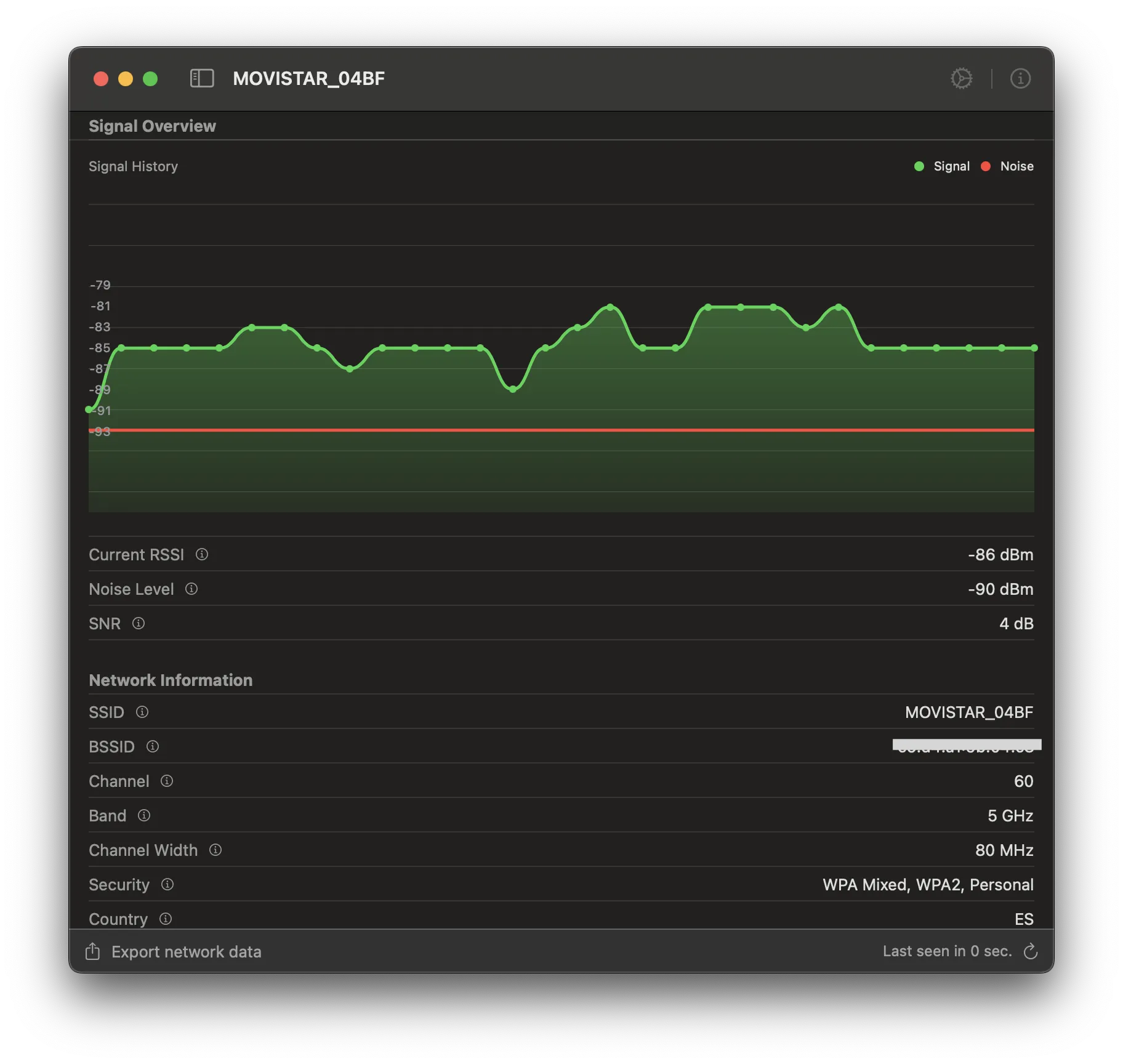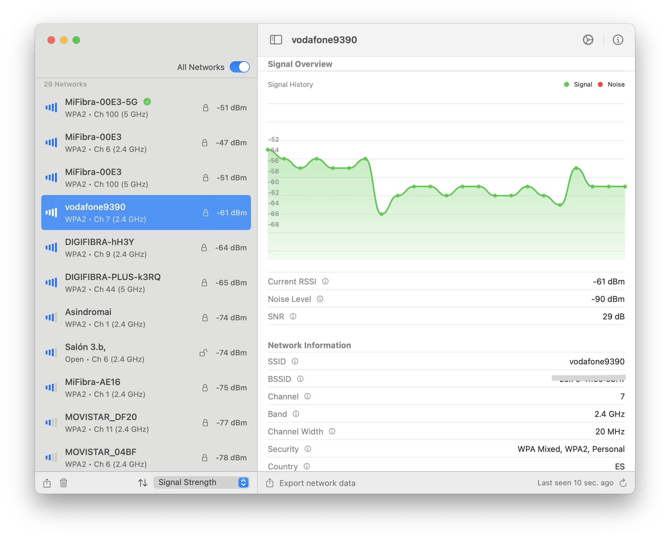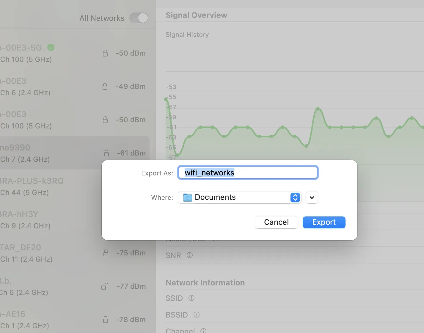 Export network details and signal history as CSV files for further analysis or sharing with IT professionals.